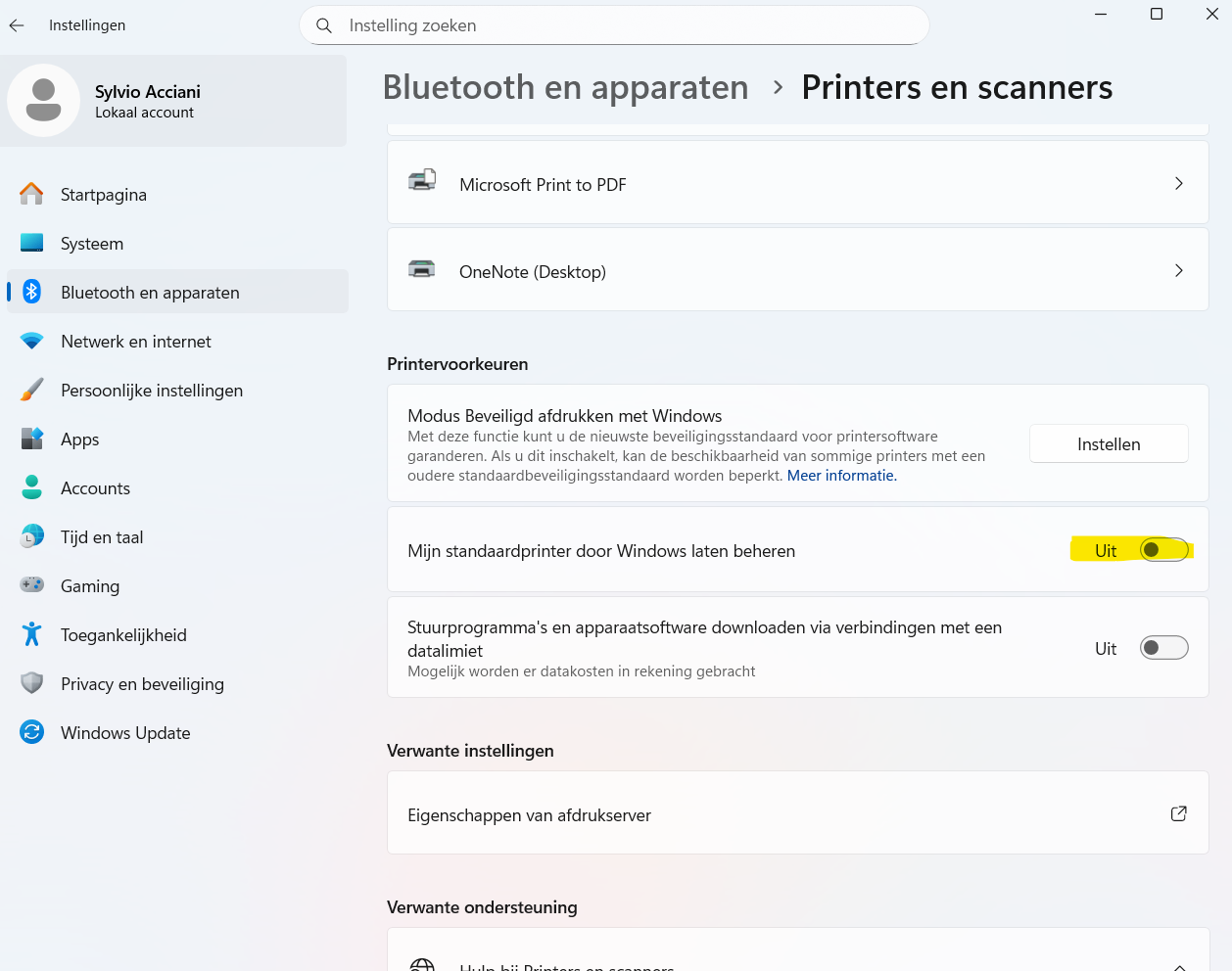Zorg ervoor dat de optie "Windows mijn standaardprinter laten beheren" is uitgeschakeld (vinkje weghalen).